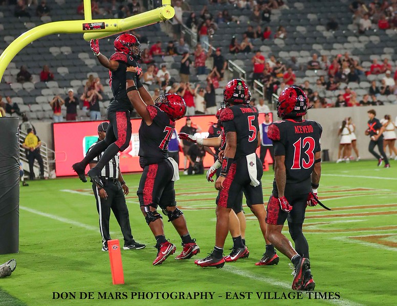 Aztecs celebrate a TD against Stony Brook. Credit: Don De Mars Photography/EVT