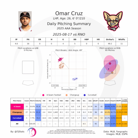 Kyle Hart served as the opener for El Paso, surrendering a run on two hits and two walks. Hart’s slider and sweeper were as sharp as ever, as he struck out one of six batters faced. Omar Cruz threw four hitless innings as the bulk reliever. Cruz walked five batters but induced a double play and got 11 whiffs in his outing (45.3% whiff rate). Francis Pena, who came off the IL on Friday, threw a scoreless inning, and Raul Brito earned the win with 1.1 innings of scoreless relief. Sean Reynolds allowed a leadoff single in the ninth but induced a double play and groundout to seal the save and the win.