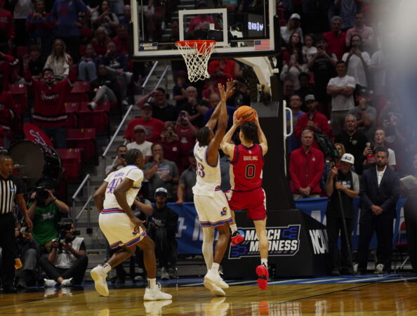13 seconds remain, and Kansas has fouls to give. Jayhawks flock to Dylan Darling every time he gets the inbound; four fouls later, just 3 seconds remain. Darling takes the inbound, finds a lane, and gets a right-hander up as time expires… and it falls.